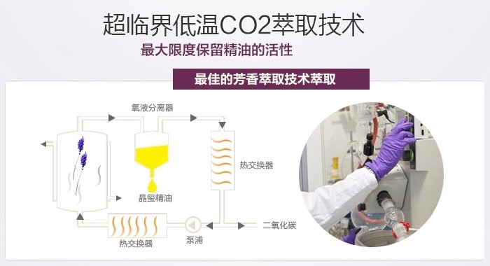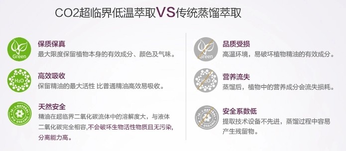 天然安全精油在超临界二氧化碳流体中的溶解度大,与液体二氧化碳完全相容,不会破坏生物活性物质且无污染,分离能力高。